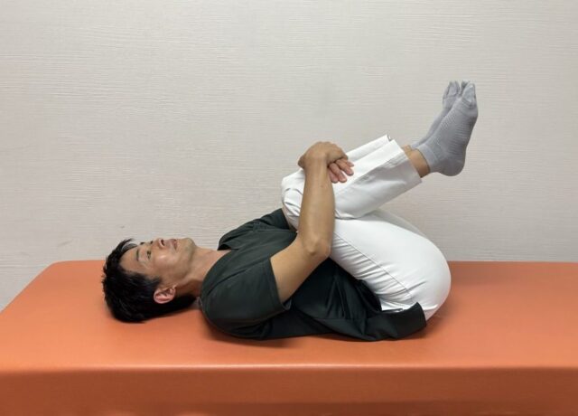 仰向けに寝て両膝を抱え、胸に引き寄せます。この姿勢で10秒から20秒キープし、ゆっくりと元に戻します。腰から背中にかけての筋肉を優しく伸ばすことができる、ぎっくり腰回復期におすすめのストレッチです。痛みが出ない範囲で1日に2回から3回行ってみてください。