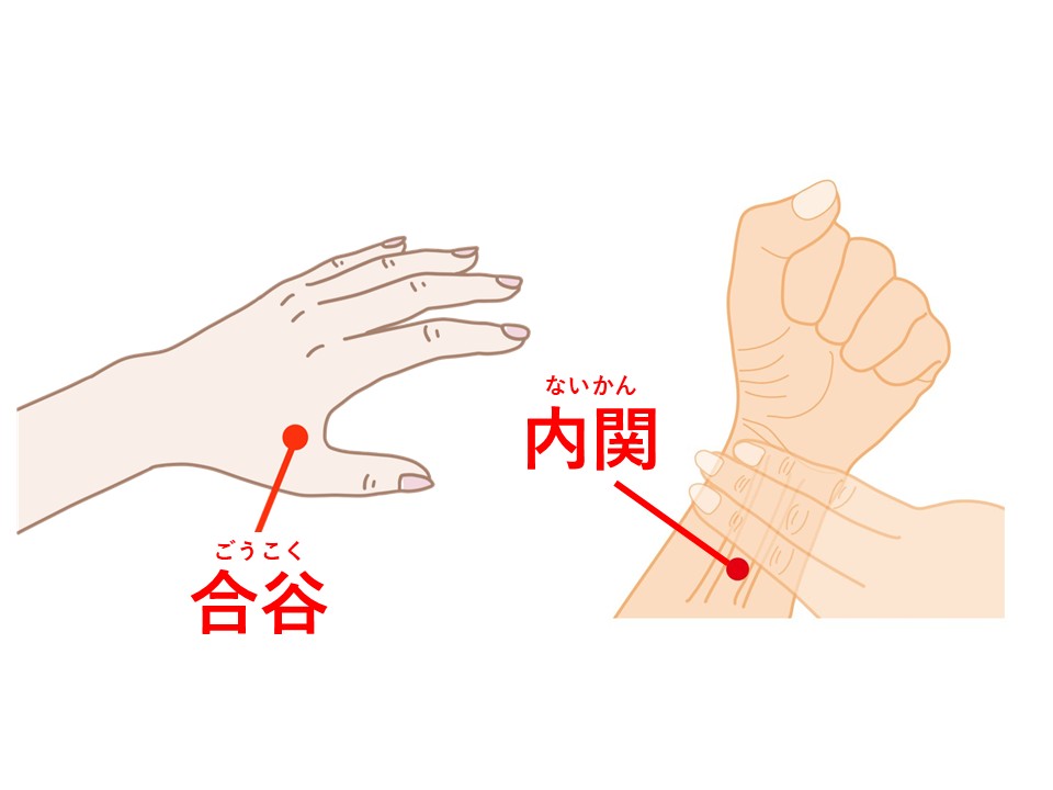 ここをゆっくり押していると胸のあたりまでじんわり響く感じがあり、精神的な緊張を和らげたり、吐き気や乗り物酔いにも使われることがあります。寝る前にここを押しながら、あとでご紹介する呼吸法を合わせて行うと、より深くリラックスできる方が多いです。