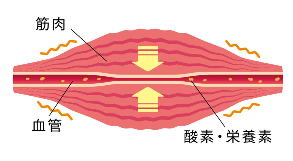 気温が低下すると、体は熱を逃がさないように血管を収縮させます。すると筋肉や神経への酸素と栄養の供給が低下し、筋肉が硬くなり柔軟性が失われていきます。さらに血行不良により、疲労物質や老廃物の排出が遅れて、筋肉の緊張やこわばりが強くなっていくんです。