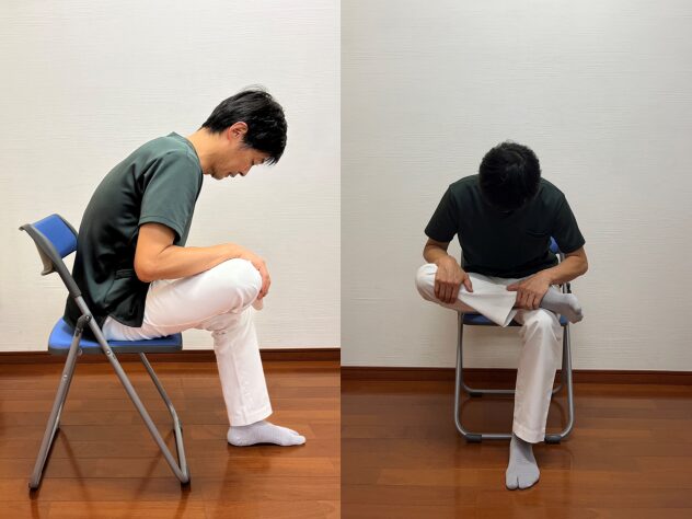 股関節が硬いと歩幅が狭くなり、小刻みな歩き方になってしまいます。これも転倒リスクを高める要因の一つです。椅子に座った状態で、片方の足首を反対側の太ももの上に乗せます。背筋を伸ばしたまま、上体をゆっくりと前に倒していきます。
