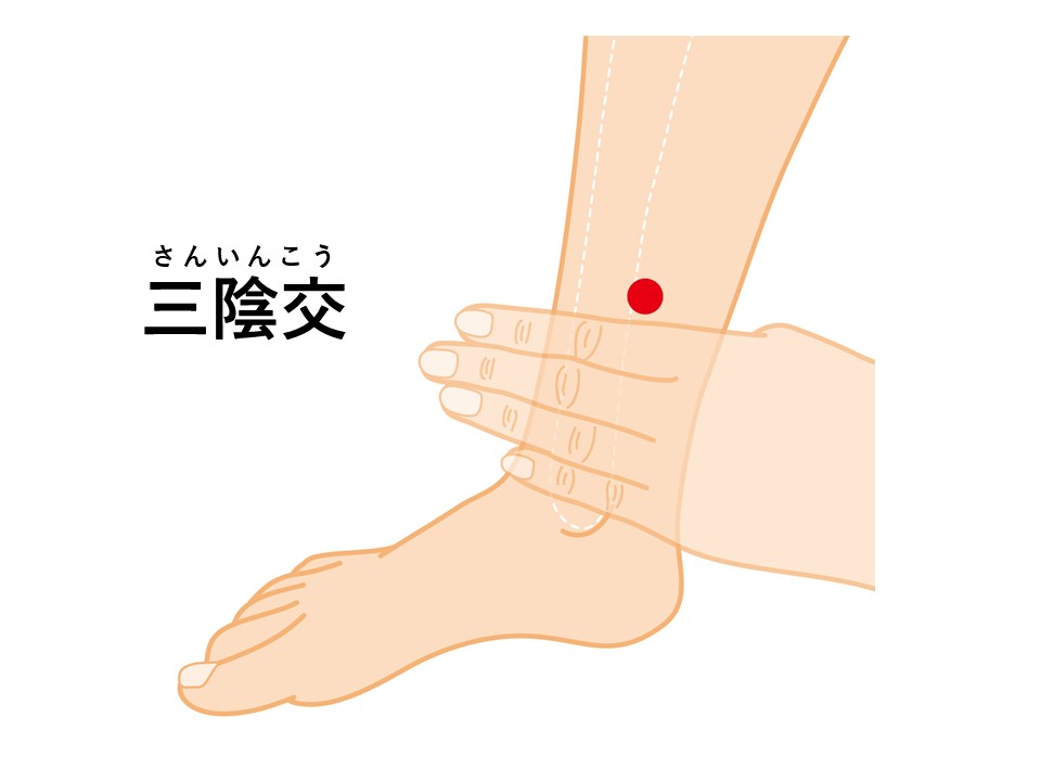 三陰交は内くるぶしの一番高いところから、指4本分上がったところにあるツボです。女性特有の不調に特に効果的で、冷えだけでなく生理痛やむくみの改善にも役立ちます。骨と筋肉の境目あたりを押すと、やや痛みを感じる場所です。