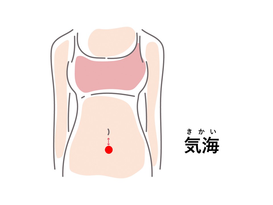 気海はおへそから指2本分下にあるツボです。「気の海」という名前の通り、体のエネルギーが集まる場所とされています。お腹の冷えに悩む方、内臓から冷えを感じる方に特におすすめです。