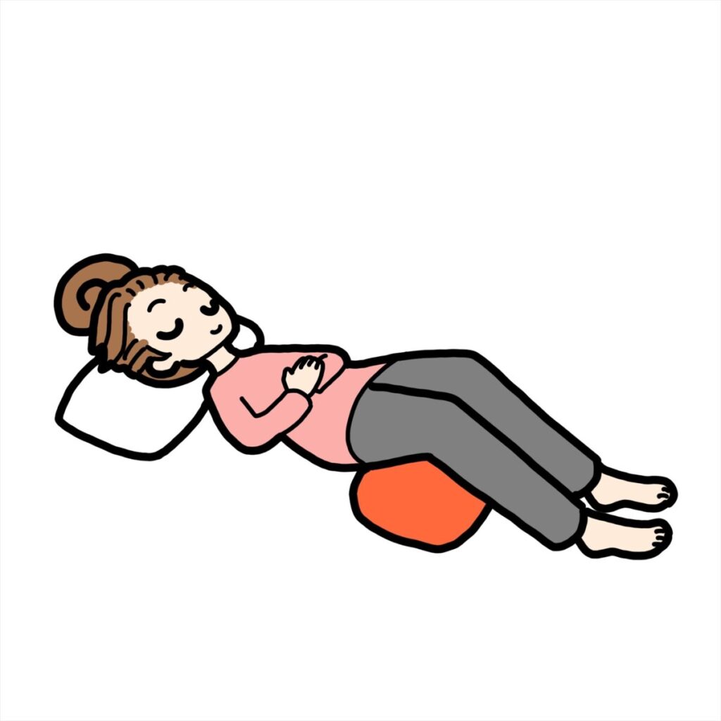 仰向けに寝て、膝の下にクッションや座布団を入れる(膝が90度程度曲がる高さ)