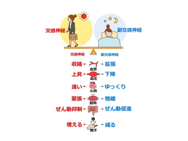 自律神経は、わたしたちが意識しなくても心臓を動かしたり、血圧を調整したりしている大切なしくみです。交感神経と副交感神経のふたつがバランスをとってからだを支えています。