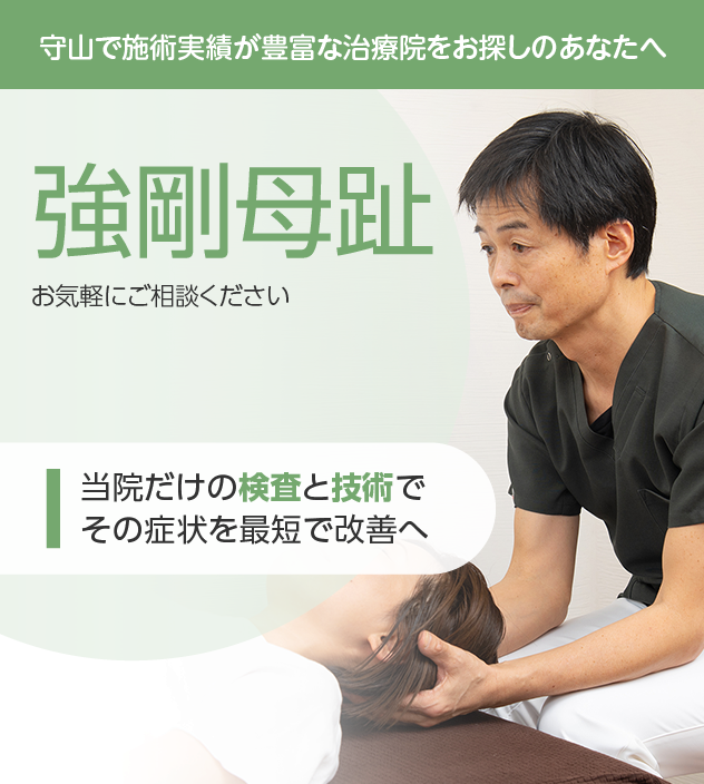 通いやすさも改善のためには重要なポイントです。守山駅から徒歩5分、駐車場も完備してますので遠方からも安心して通っていただけます。平日は21時まで、土曜日、祝日も開院しております。完全予約制のため、お待たせすることもありません。